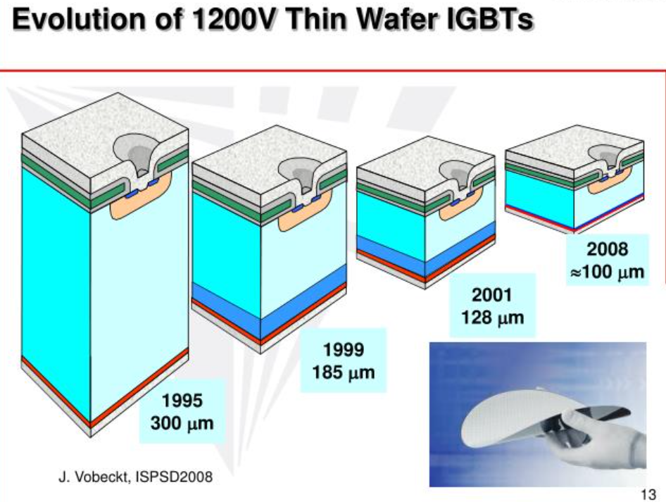 : PM-IC (IGBT) 는 점점 Wafer 두께가 얇아지고 있는 추세다. Wafer가 얇아짐에 따라 Wafer 처짐 이슈와 함께 Crack에 취약하게 된다. 이에따라 일본 Disco社 Taiko Process를 통한 Wafer 끝단까지 연마를 하지않고 피자 Edge처럼 Edge Grinding 시 끝단을 남겨두는 형태로 진행된다.