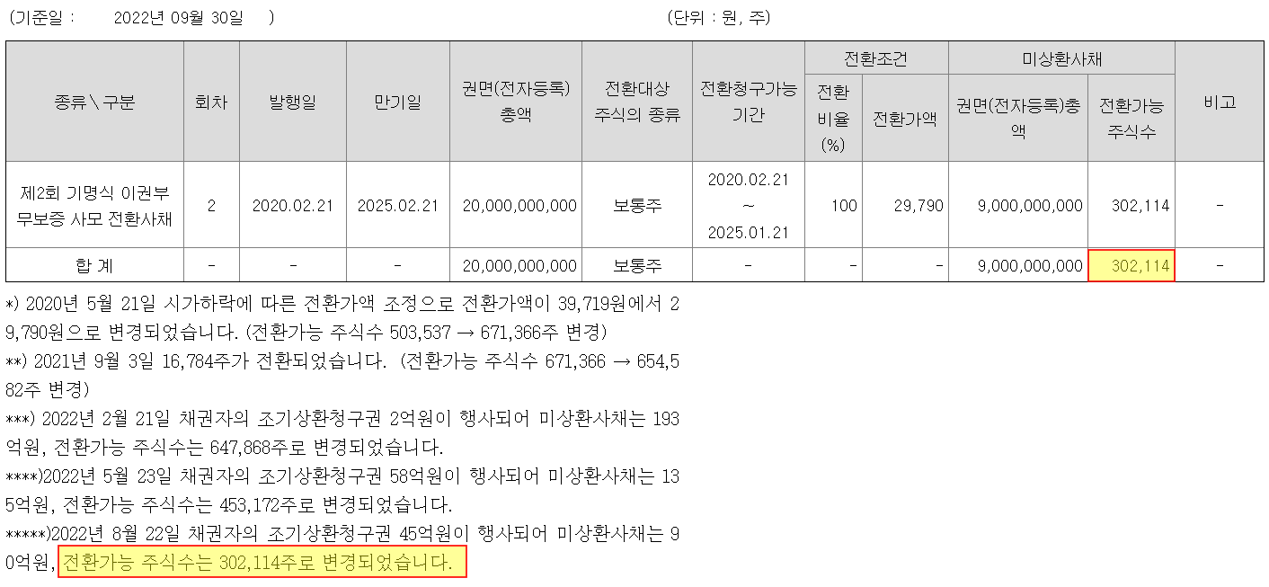 2020.02.21일 발행한 2회차 전환사채 발행을 200억, 3회차 신주인수권부사채 100억이 있으나 2022년 계속하여 조기상환을 진행하여 현재 남은 전환가능 주식수는 2회차 기준 302,114주, 3회차 기준 278,618주가 잔여로 남아있다. (총 580,732)