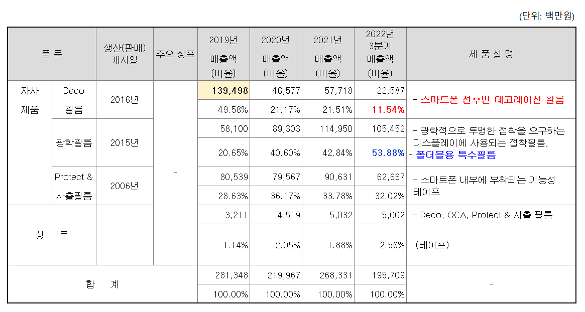 기존 Deco필름 매출액이 2019년 기준으로 볼때 매출하락폭이 80%이상으로 확인된다.