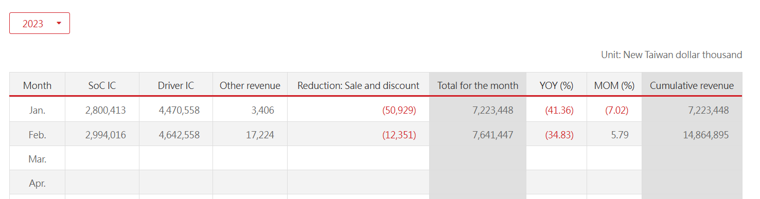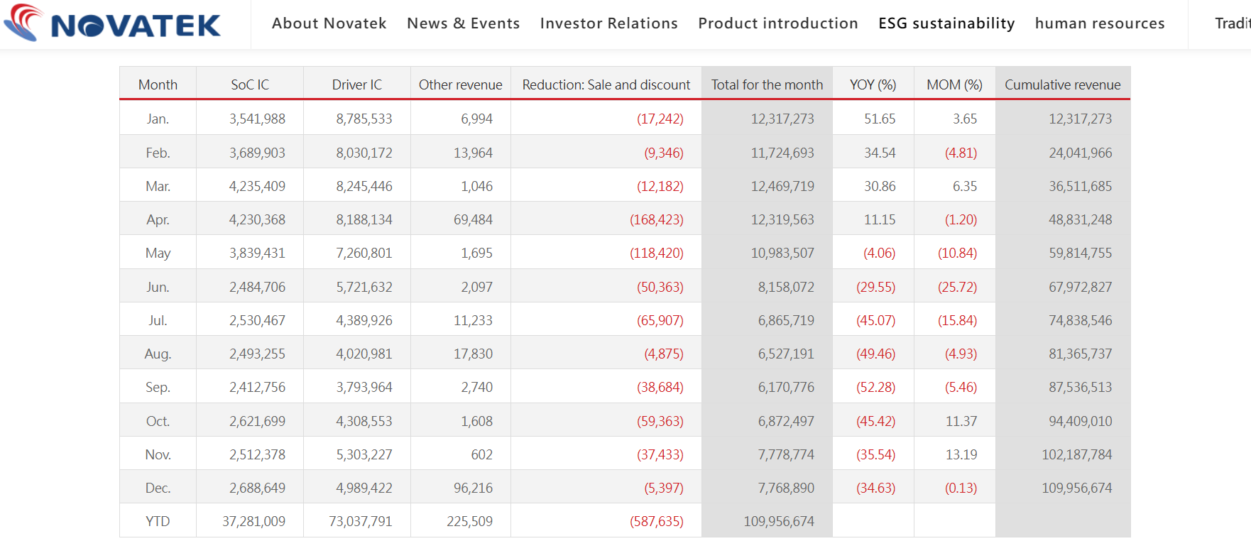 DDI 마켓쉐어 3위 업체인 노바텍의 경우 2022년 월별 기준 DDI 매출액 추이를 봤을때 1월대비 12월 매출액이 40%이상 하락한것으로 확인된다. 그만큼 전방시장에 대한 수요가 굉장히 좋지않은 상황이였으며 현재 2023년에도 월별 추이가 크게 바뀌지 않았음을 보여진다.