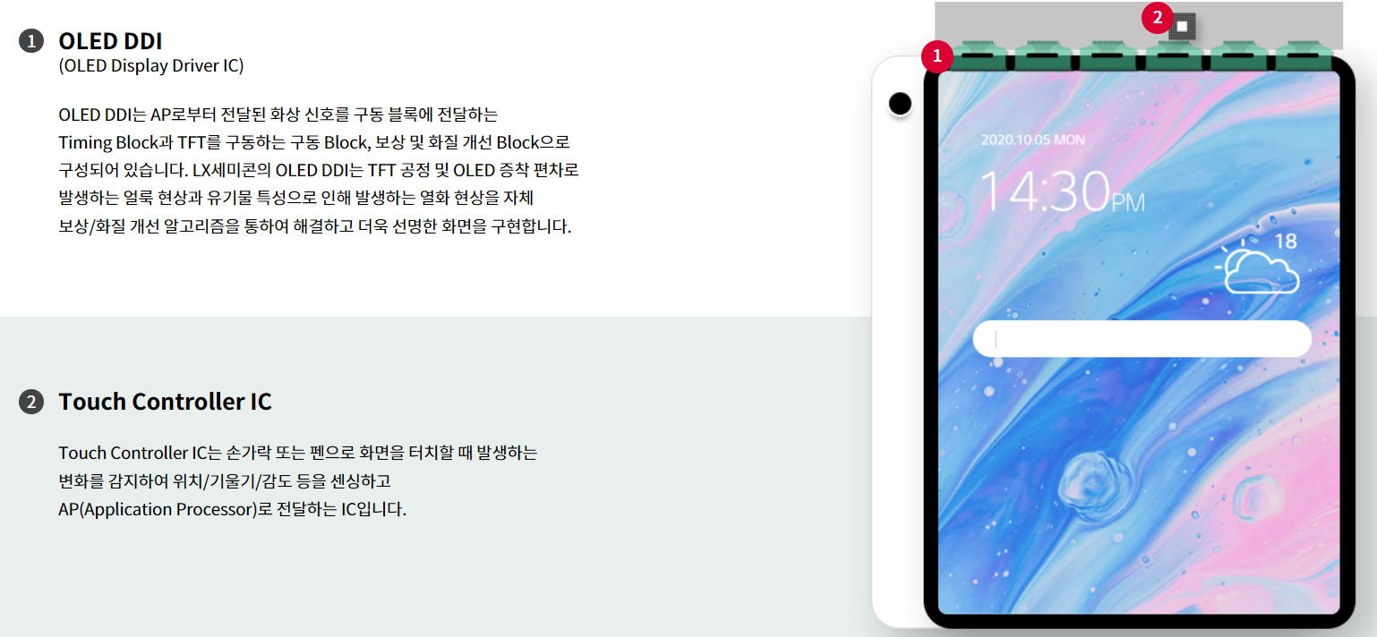 아이패드 경우 판매량 측면에서는 아이폰에 못미치지만, 화면의 대면적화에 따른 1개 제품에 들어가게 되는 OLED DDI는 3~5배 이상 증가할 것이라고 예상되며, 제품 1대가 가져오는 매출은 아이폰 대비 3배이상 클 것이다. 또한 애플의 상징성은 아마 중화권 태블릿 메이커들을 자극하게 될것이고 전체 파이가 커질 것으로 보여진다.