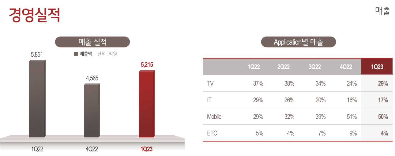 통상적으로 1Q는 Mobile 비수기에 해당하나 TV/IT향 매출이 줄어든 영향으로 Mobile쪽 매출 비중이 1Q까지 50% 늘어난것으로 추정된다. 최근 아이폰14 노랑색 Color 신규출시를 통해 15출시 전까지 Long Tail 전략으로 진행하는 것으로 보여지며 아이폰 14 및 14플러스 매출이 2Q까지 이어질 것으로 보인다.