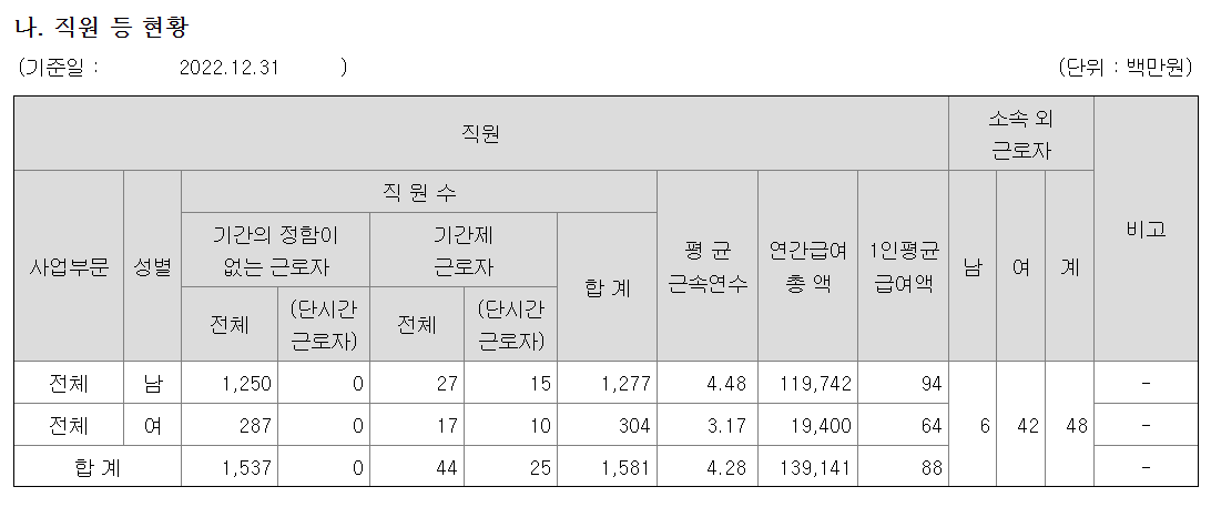 전체 직원현황은 전년말 대비 300명이 증가한 1537명이다.