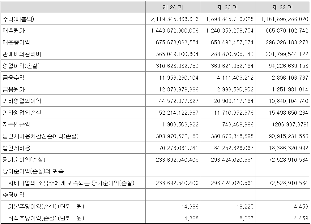 전년대비 매출원가 및 매출총이익이 증가하였으나, 그 증가폭 대비 판관비 증가폭이 가파른 상황이다.