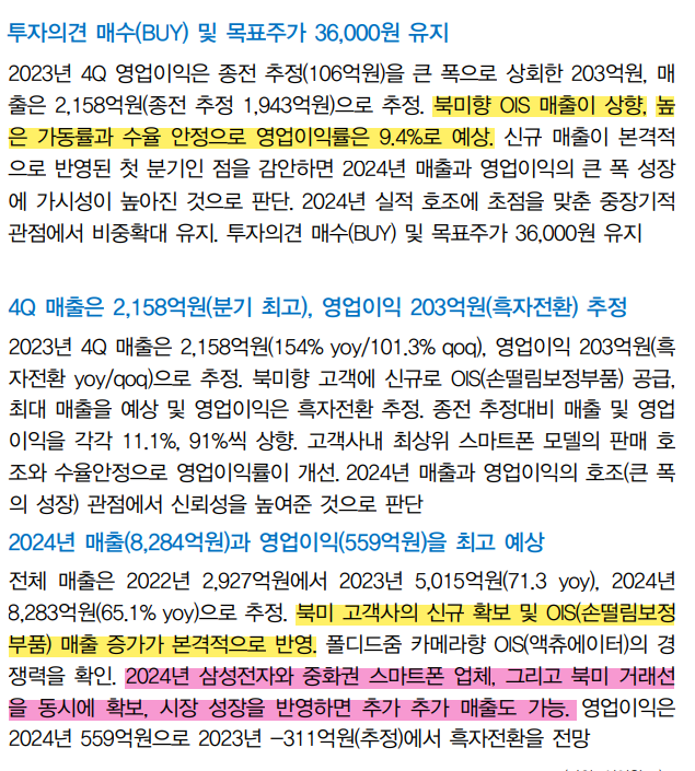 대신증권 박강호 애널 최근 보고서에서 24F 매출액 및 영업이익을 모두 상향조정 하였다.